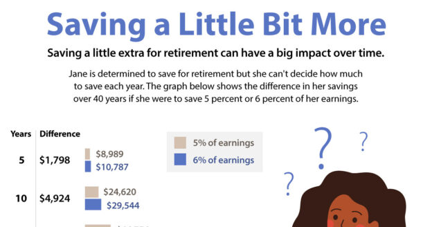 How much of a difference would it make? You can check it out yourself using this online calculator and your own salary and savings information. Calculate the impact of your current savings, then try the same calculation with an additional 1 percent of your earnings. For example, if you’re saving 5 percent of your pay, see what saving 6 percent would do by the time you expect to retire.