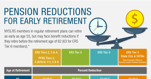 Members in regular retirement plans can retire as early as age 55, but they may face significant pension reductions if they retire before their full retirement age. The full retirement age for members in most tiers is 62, and it’s 63 for Employees’ Retirement System (ERS) Tier 6 members and for Police and Fire Retirement System (PFRS) Tier 6 members who leave public employment before retirement age, but have enough service to receive a pension. If you joined NYSLRS on or after April 1, 2012, you are in Tier 6.